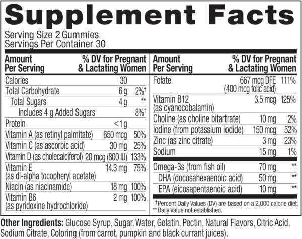 Los productos en el interior: El ácido fólico apoya el crecimiento y el desarrollo de tu pequeño. DHA es un ácido graso esencial que apoya el desarrollo saludable del cerebro y los ojos para bebés y nutrientes como vitaminas C y E que apoyan la salud general durante el embarazo
