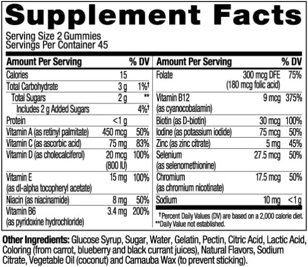 CONTENIDO: Las vitaminas masticables diarias incluyen los nutrientes que tu cuerpo necesita. Las vitaminas del complejo B contribuyen a la producción de energía celular para que tu cuerpo funcione durante todo el día. Los antioxidantes, como las vitaminas A, C y E, ayudan a combatir los radicales libres y promueven la salud cardiovascular.